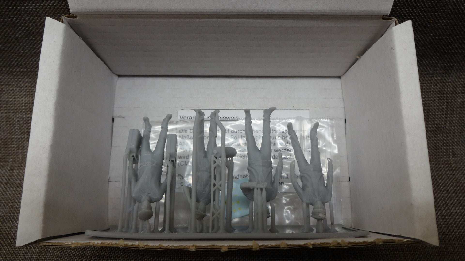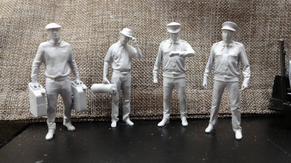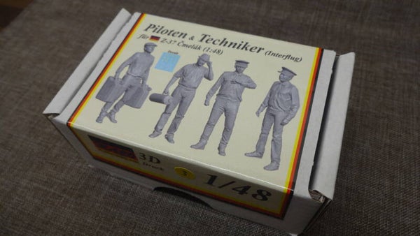 Vierteiliger Satz mit 4 Figuren für Z-37 (1/48) von MACO. 2 stehende Piloten in der Uniform der Interflug (DDR) und 2 stehende Mechaniker mit Feuerlöscher und Kanistern. 3D-Druck (Resin). Farbe hellgrau.